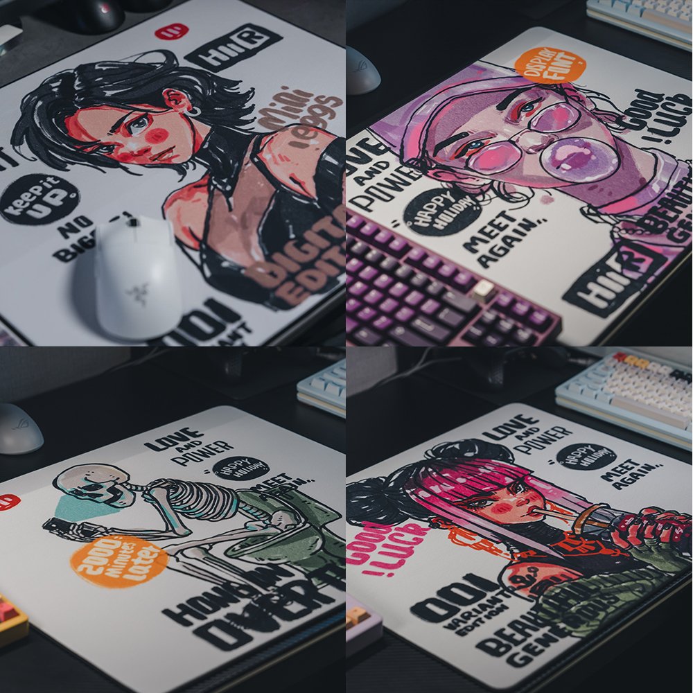 This mousepad comes in the classic 490*420*4mm size, with 4 different designs to choose from. They’re all of course drawn by hand with a very cool-looking american comic style. Here’s a picture of the different designs: