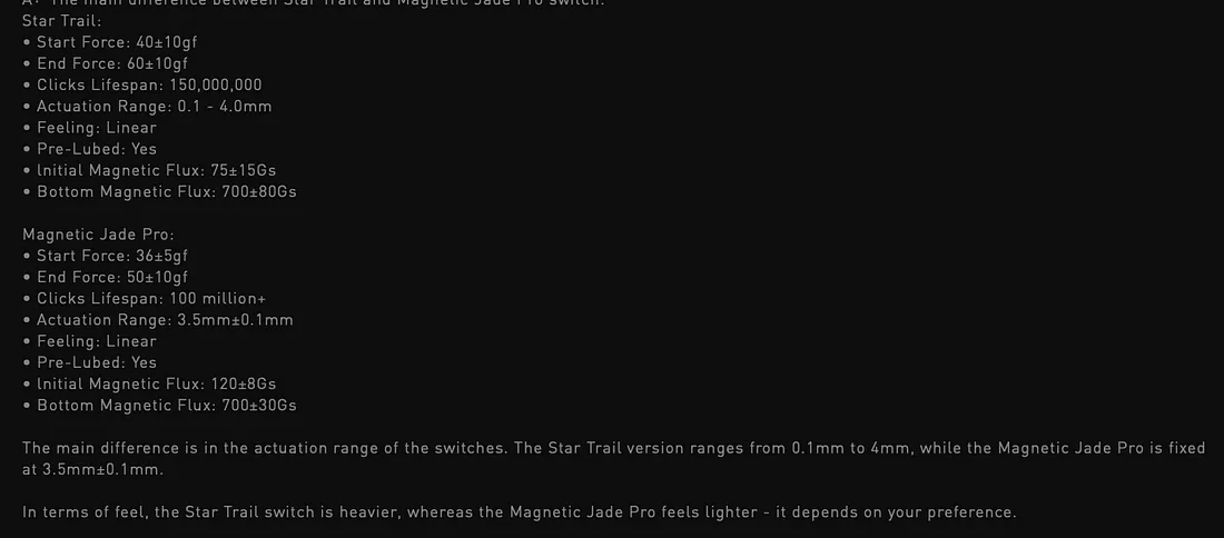 On the other hand, Jade Pro switches have made their way to become one of the industry’s most acclaimed magnetic switches in 2024, and that’s for a reason. They are a bit smoother and more stable when bottoming out, also lighter to press, with some different sound profile. Some say they’re the best and they could have a point there. It’s great that Iqunix added them into the pack so that you can try them out without breaking the bank (they’re not cheap!).