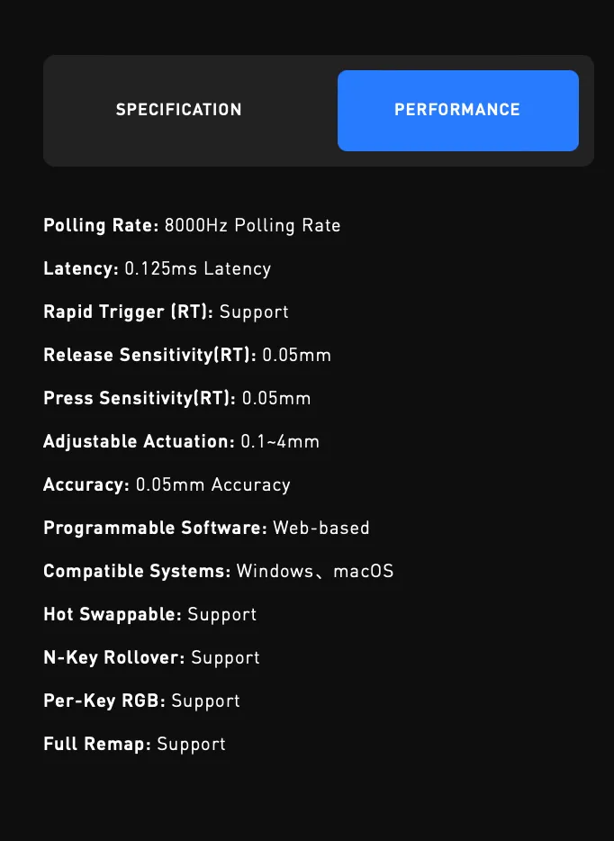 The software as of now enables basic features like setting Actuation Point, Rapid Trigger (very sensitive 0.05mm), Dead Zone, SOCD, RGB, layers. professional players settings by one-click etc. It lacks Mod Tap, macros, profiles management, polling rate setting (at default it’s set to 8k) and some more advanced features that competitors have. Iqunix says they’re working hard on updates but I wish they were a bit faster with updates because the last update was on October 2024 (I’m writing this at the end of December 2024). But even with delays in development, they have released some interesting options, take a look: